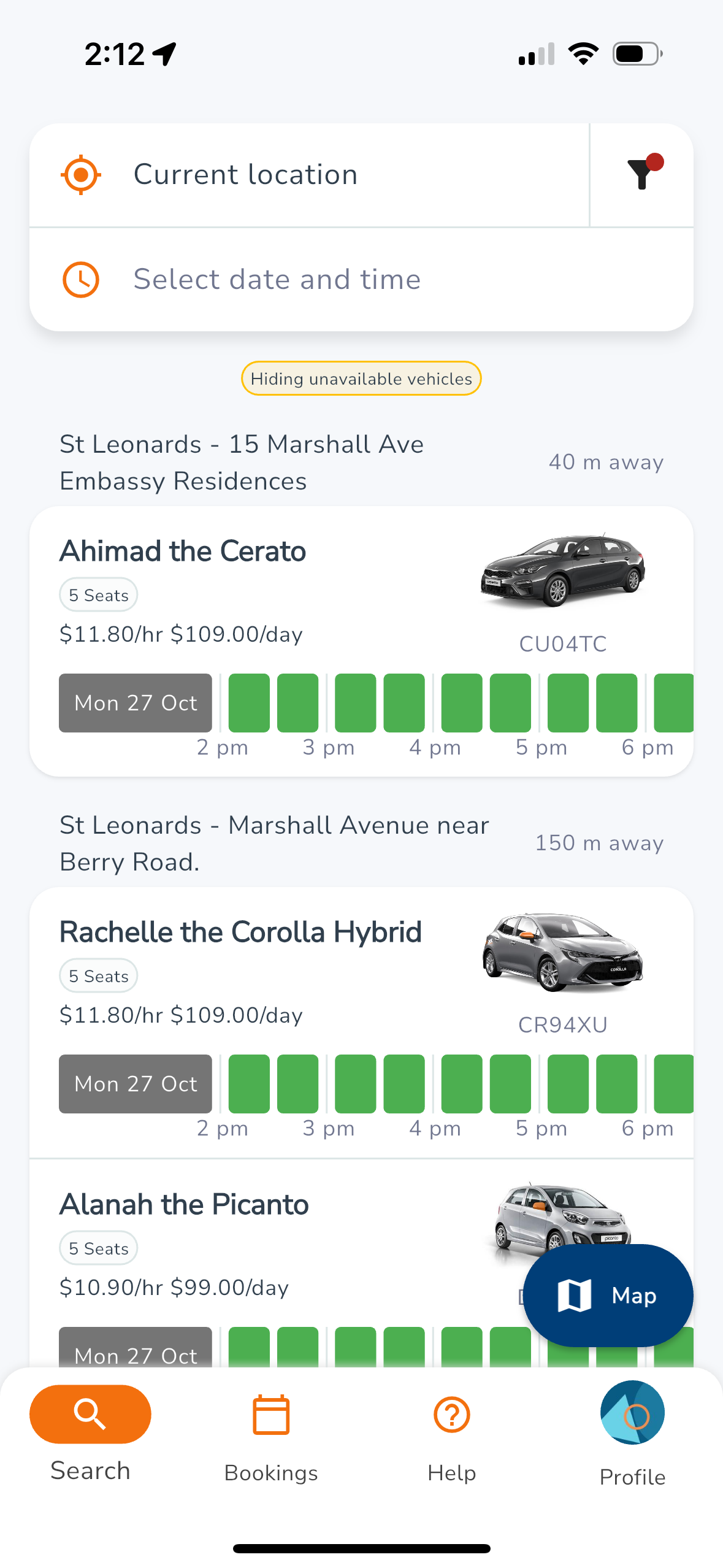Then, select the car you want to book by clicking on the green bar. Cars that are booked out, will be grey.